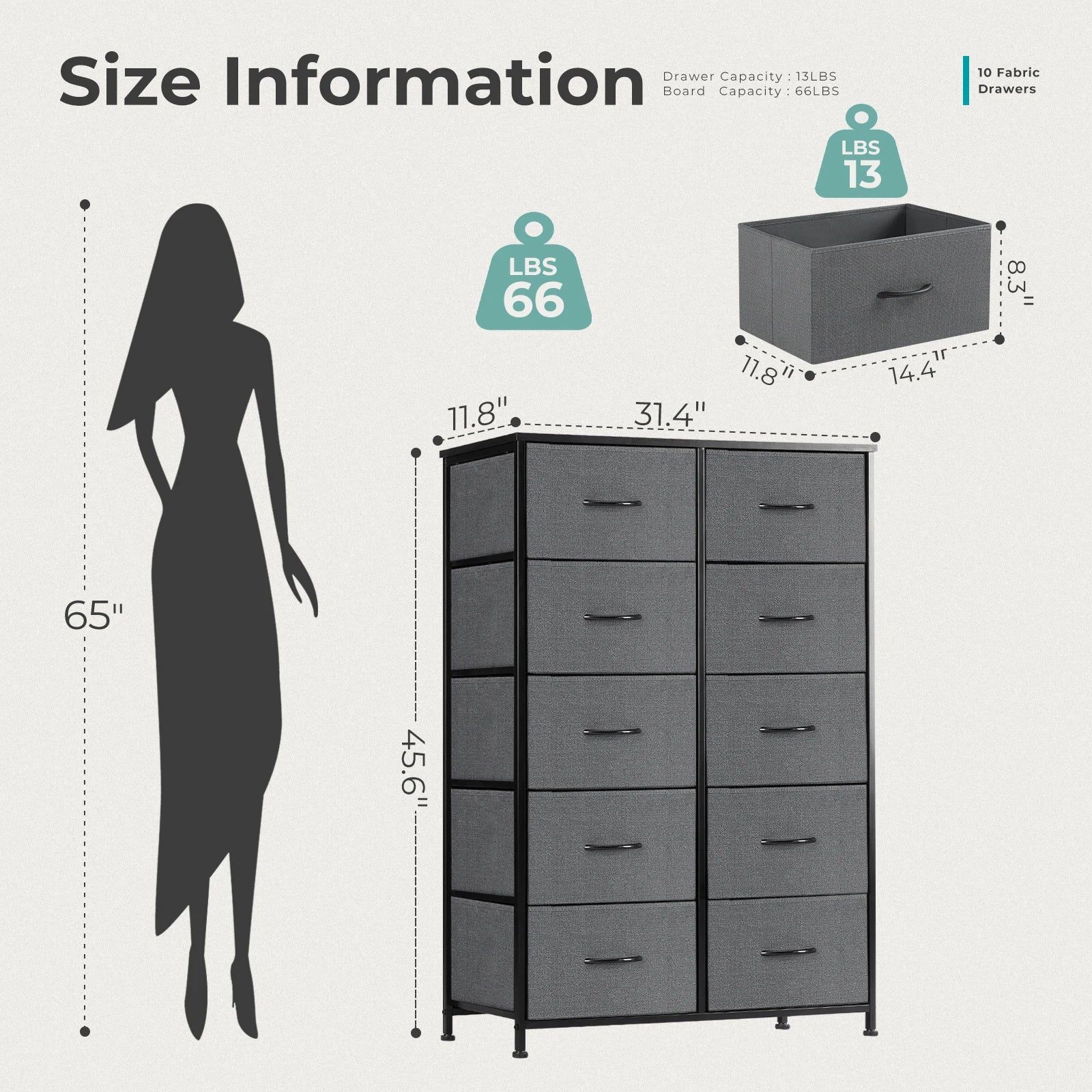 Bedside Table With 10 Fabric Drawers, Nightstand Storage Cabinet With Steel Frame